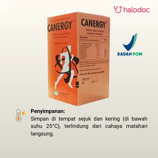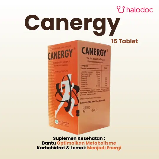 Canergy adalah suplemen kesehatan yang mengandung L-carnitine, ALA, vitamin B kompleks, vitamin C, dan coenzyme Q-10. Canergy tablet digunakan untuk membantu proses metabolisme karbohidrat, protein, dan lemak di dalam tubuh menjadi energi.
