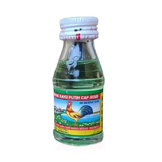 CAP AYAM MINYAK KAYU PUTIH mengandung 100% minyak kayu putih alami, digunakan untuk meringankan masuk angin, perut kembung, sakit kepala, pusing, gatal-gatal akibat gigitan serangga atau nyamuk, rasa mual.