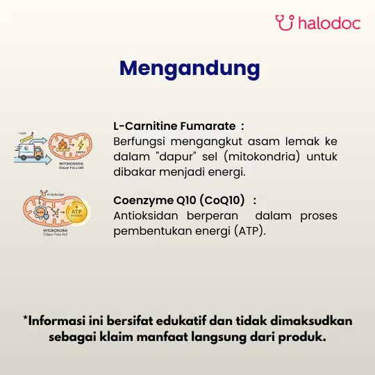 - L-Carnitine Fumarate: L-Carnitine adalah asam amino yang berperan penting dalam metabolisme energi. Fungsi utamanya adalah membantu mengangkut asam lemak rantai panjang ke mitokondria (pembangkit energi sel), di mana asam lemak tersebut diubah menjadi energi.