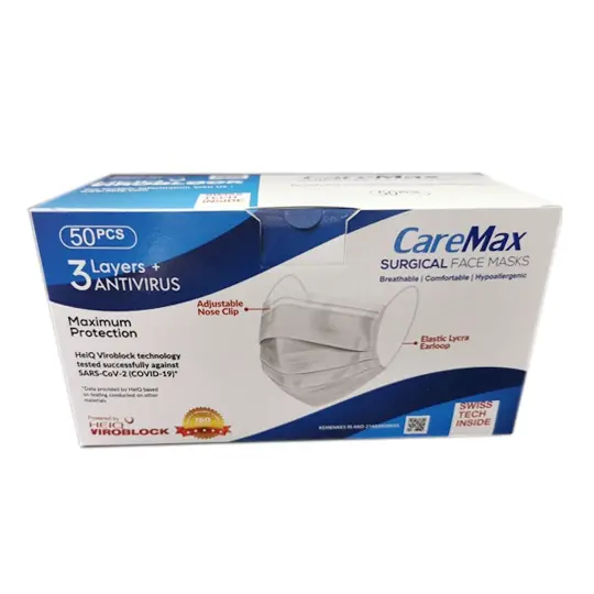 Caremax Surgical Face Masks Viroblock merupakan masker medis sekali pakai yang memiliki filter 3 lapis dan HeiQ Viroblock NPJ03, teknologi masker antivirus yang memiliki perlindungan efektif terhadap virus dan bakteri yang menempel pada permukaaan masker.