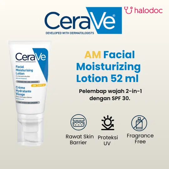CeraVe AM Facial Moisturizing Lotion 52 ml adalah pelembap wajah pagi hari dengan fungsi ganda, yang dirancang untuk memberikan hidrasi sepanjang hari sekaligus melindungi kulit dari paparan sinar UV. Setiap pagi, kulit membutuhkan perlindungan dari faktor eksternal seperti sinar matahari yang dapat merusak skin barrier. Dilengkapi dengan filter UV spektrum luas (Broad Spectrum) SPF 25, produk ini membantu melindungi kulit dari sinar UVA dan UVB. Seperti produk CeraVe lainnya, formulanya mengandung tiga Ceramide esensial, Asam Hialuronat, dan Niacinamide untuk membantu memulihkan skin barrier dan menenangkan kulit. Teknologi MVE memastikan pelepasan bahan-bahan pelembap ini secara bertahap untuk hidrasi yang bertahan lama.