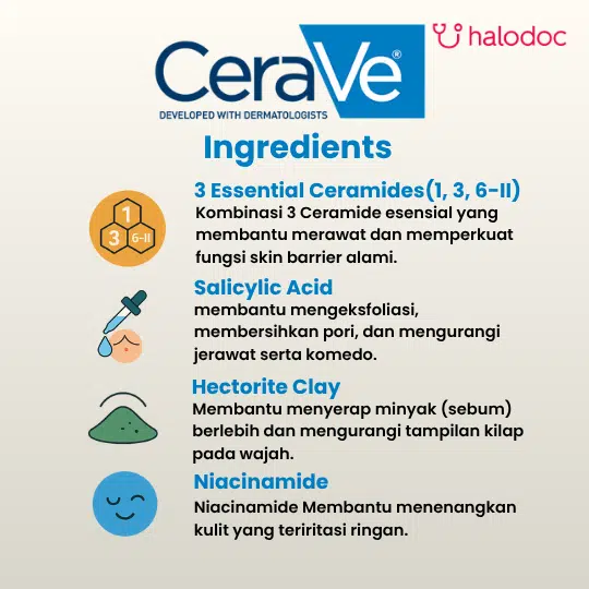 Formula ini mengandung 2% Asam Salisilat (Salicylic Acid/BHA) untuk membersihkan pori-pori dan mengangkat sel kulit mati. Didukung oleh Hectorite Clay yang membantu menyerap minyak berlebih tanpa membuat kulit terasa kering. Seperti produk CeraVe lainnya, pembersih ini diperkaya dengan tiga Ceramide esensial untuk menjaga keutuhan skin barrier dan Niacinamide untuk menenangkan kulit.