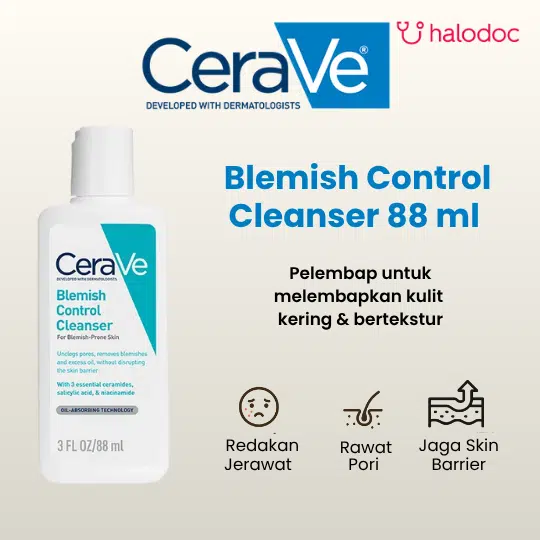 CeraVe Blemish Control Cleanser 88 ml adalah pembersih wajah bertekstur gel-ke-busa (gel-to-foam) yang diformulasikan untuk kulit yang rentan berjerawat dan berkomedo. Pembersih ini bekerja dengan dua aksi utama: membersihkan pori-pori secara mendalam untuk mengangkat kotoran dan minyak berlebih, sekaligus melakukan eksfoliasi ringan untuk mengurangi sumbatan yang dapat memicu jerawat. Mengandung Asam Salisilat (Salicylic Acid), pembersih ini membantu meluruhkan sel kulit mati dan mengurangi tampilan komedo. Yang membedakannya adalah formula ini diperkaya dengan tiga Ceramide esensial dan Niacinamide untuk membantu menjaga dan memulihkan fungsi lapisan pelindung kulit (skin barrier). Dengan demikian, formula ini membantu untuk mengurangi rasa kering atau tertarik yang seringkali muncul setelah mencuci wajah dengan produk untuk kulit berjerawat.