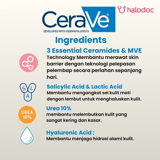 Formula ini menggabungkan bahan-bahan eksfolian seperti Asam Salisilat (BHA), Asam Laktat (AHA), dan Urea 10% untuk membantu menghaluskan dan melembutkan tekstur kulit. Untuk menjaga kesehatan skin barrier, formulanya diperkaya dengan tiga Ceramide esensial, Asam Hialuronat, dan Niacinamide yang berfungsi memulihkan dan menghidrasi kulit. Seluruh kandungan ini dilepaskan secara bertahap oleh Teknologi MVE untuk memberikan efektivitas yang tahan lama.
