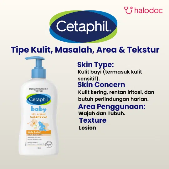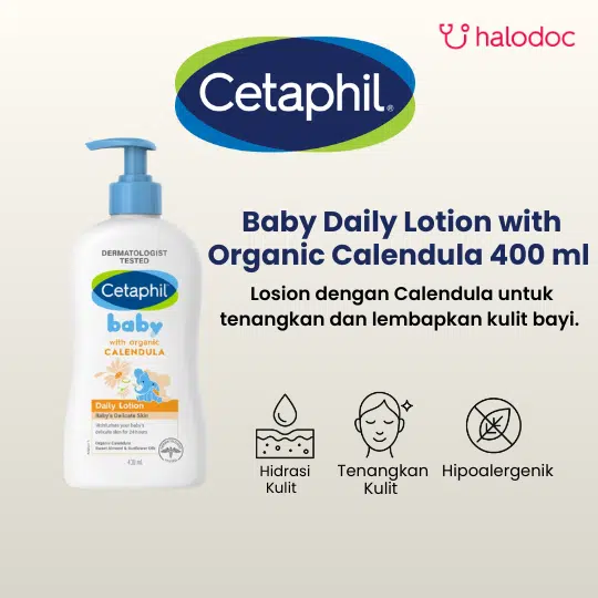Cetaphil Baby Daily Lotion with Organic Calendula adalah losion perawatan bayi yang sudah diuji secara dermatologis untuk menjaga kelembapan kulit hingga 24 jam dan menutrisi kulit lembut bayi. Cetaphil Baby Daily Lotion with Organic Calendula mengandung minyak bunga matahari yang kaya akan antioksidan, minyak sweet almond dan calendula organik yang membantu menenangkan, melembutkan kulit, dan menjaga tekstur kulit bayi.