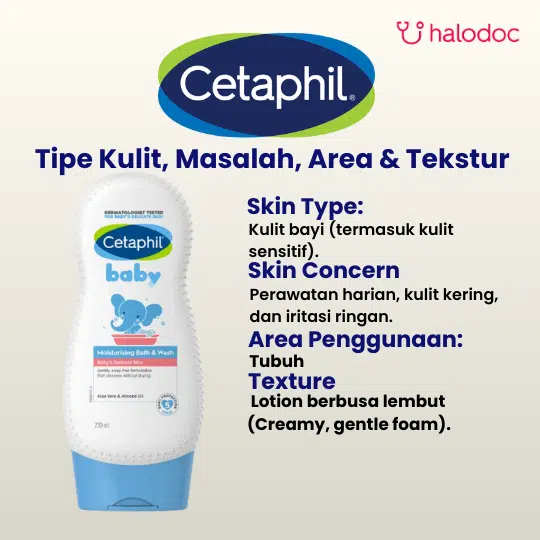 CETAPHIL BABY MOISTURIZING BATH & WASH merupakan lotion pembersih yang dapat membersihkan dan membantu melembapkan kulit bayi. Produk ini mengandung mengandung aloe vera yang dapat membantu menenangkan kulit bayi dan mengandung Almond Oil yang membantu melembapkan kulit bayi.