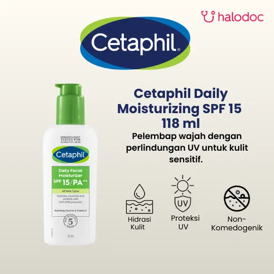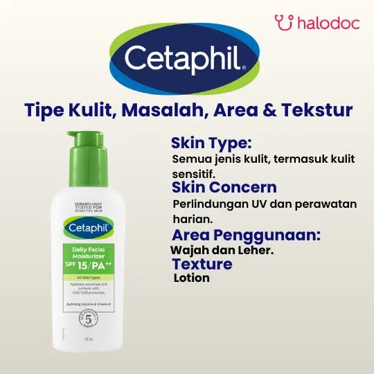 CETAPHIL DAILY MOISTURIZING SPF 15 merupakan produk pelembap wajah yang memberikan kelembaban dan perlindungan UV untuk semua jenis kulit. Kandungan SPF 15 PA++ pada produk ini membantu melindungi kulit dari efek buruk sinar UVB dan UVA.