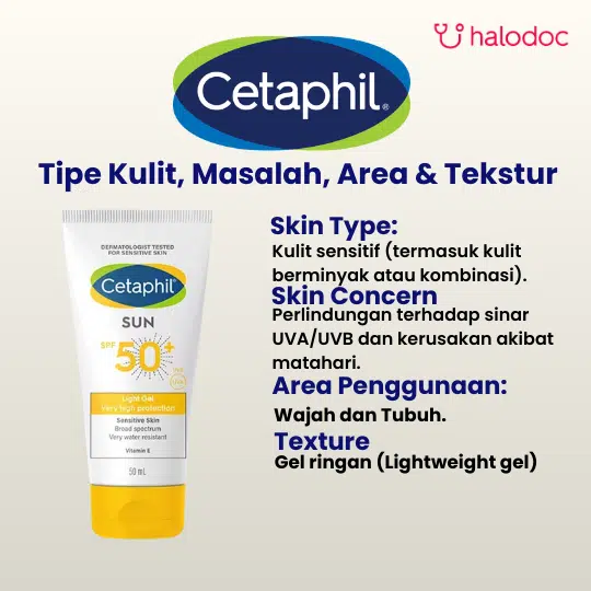 Cetaphil Sun SPF50+ Light Gel 50 ml adalah hybrid sunscreen dengan tekstur gel ringan yang diformulasikan untuk memberikan perlindungan matahari yang tinggi. Dengan SPF 50+, produk ini menawarkan perlindungan spektrum luas terhadap sinar UVA dan UVB, yang merupakan penyebab utama dari pigmentasi kulit dan penuaan dini. Berkat formulanya yang ringan dan tidak lengket, tabir surya ini cepat meresap dan memberikan hasil akhir matte, sehingga nyaman digunakan setiap hari pada wajah dan tubuh, bahkan untuk kulit sensitif dan cenderung berminyak. Kandungan Vitamin E di dalamnya juga membantu menutrisi kulit, sehingga kulit tetap terasa nyaman dan terlindungi.