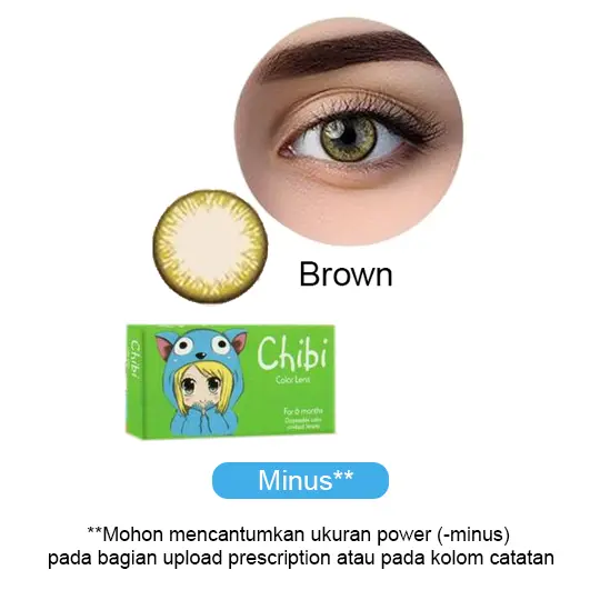 Chibi Brown merupakan softlense minus dengan masa penggunaan maksimal 6 Bulan. Softlense ini memiliki diameter 14,5 mm dan kadar air 55 %.
