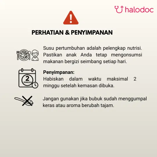 Sisa susu harus dibuang jika sudah tidak dikonsumsi selama lebih dari 2 jam, Susu harus segera diminum setelah dilarutkan, Habiskan susu dalam waktu kurang dari 2 minggu, Jangan dikonsumsi jika terjadi perubahan mencolok pada aroma, rasa dan warna susu.