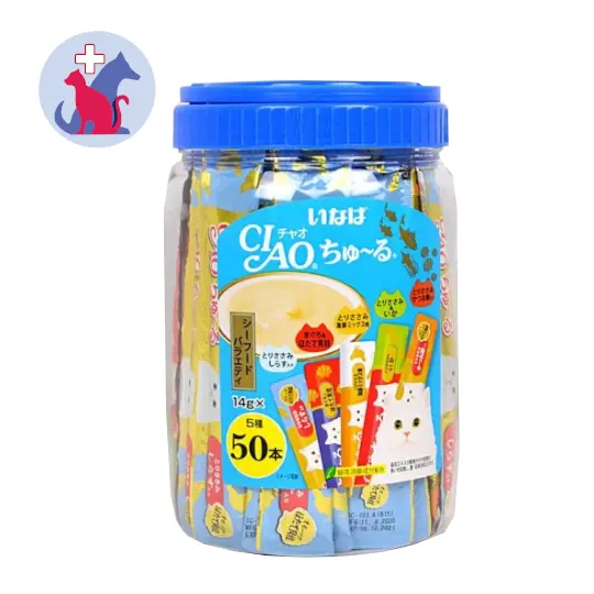 CIAO CHU-RU SEAFOOD VARIETY merupakan makanan berbentuk cair rasa ayam untuk kucing semua umur. Produk ini mengandung Green Tea Extract yang akan membantu mengurangi bau dari urin kucng Anda.