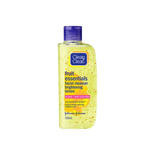 CLEAN & CLEAR FRUIT ESSENTIAL FACIAL CLEANSER LEMON menggunakan teknologi BURSTING BEADS� + Natural Lemon Extracts yang kaya akan vitamin C yang mencerahkan kulit. pembersih ini akan membersihkan minyak dan kotoran secara menyeluruh tanpa membuat kulit kering, untuk kulit terasa bersih, segar, dan tampak berseri. Direkomendasikan untuk kulit normal hingga berminyak.