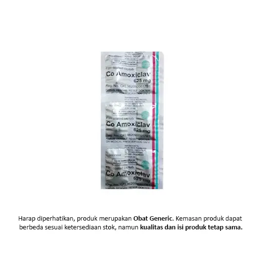 CO AMOXICLAV 625 MG TABLET merupakan obat generik antibiotik kombinasi Amoxicillin 500 mg dan Asam klavulanat 125 mg.