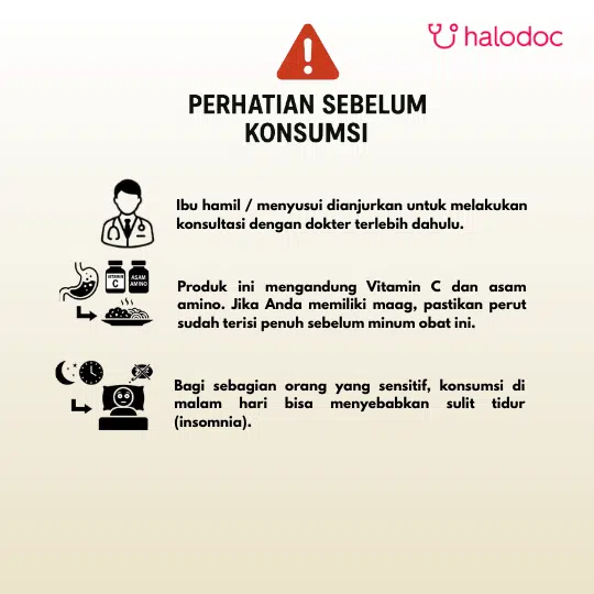 Jika Anda memiliki riwayat penyakit tertentu atau sedang mengonsumsi obat lain, konsultasikan dengan dokter sebelum menggunakan produk ini. Penggunaan vitamin sebaiknya tidak menggantikan nutrisi dari pola makan yang seimbang. Simpan pada suhu di bawah 30C, di tempat kering dan terlindung dari cahaya.
