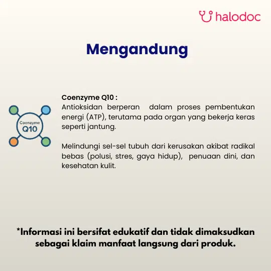 Coenzyme Q10 adalah antioksidan yang diproduksi secara alami oleh tubuh dan berperan penting dalam produksi energi seluler. CoQ10 membantu melindungi sel dari kerusakan oksidatif.