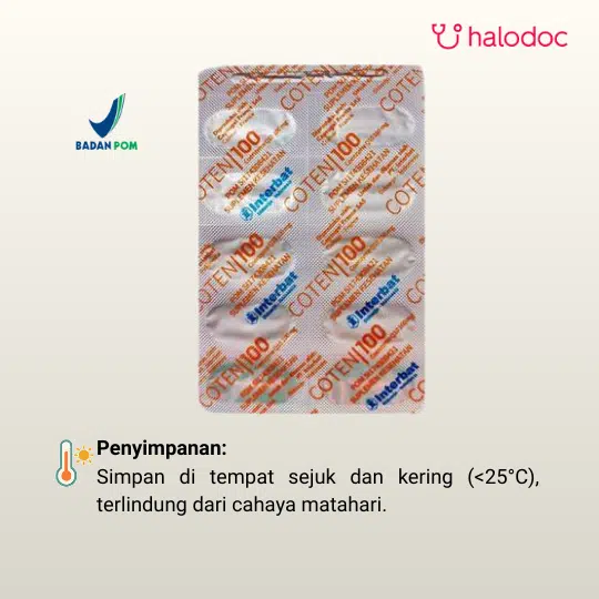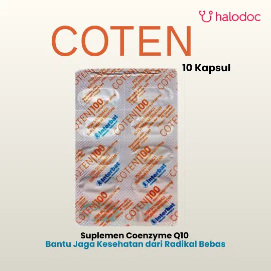 Coten 100 mg adalah suplemen yang mengandung Coenzyme Q10 (CoQ10). Suplemen ini digunakan untuk membantu memelihara kesehatan dan sebagai antioksidan.