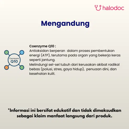 Coenzyme Q10 adalah antioksidan yang diproduksi secara alami oleh tubuh dan berperan penting dalam produksi energi seluler. CoQ10 membantu melindungi sel dari kerusakan oksidatif.