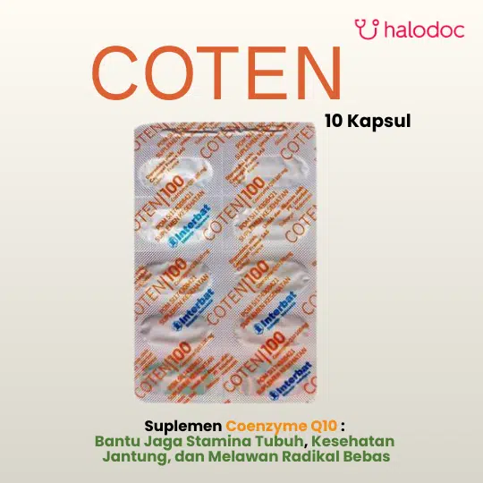 Coten 100 mg adalah suplemen yang mengandung Coenzyme Q10 (CoQ10). Suplemen ini digunakan untuk membantu memelihara kesehatan dan sebagai antioksidan.