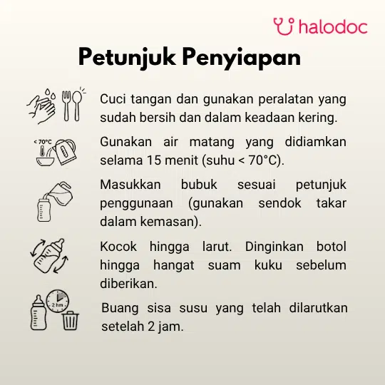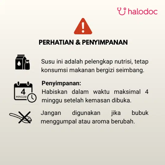 Simpan susu bubuk dalam kemasan dengan cara melipat kantung sachet beberapa kali dan simpan dalam toples yang kering, bersih dan kedap udara. Simpan di tempat yang kering dan sejuk. Habiskan dalam waktu 3 minggu.