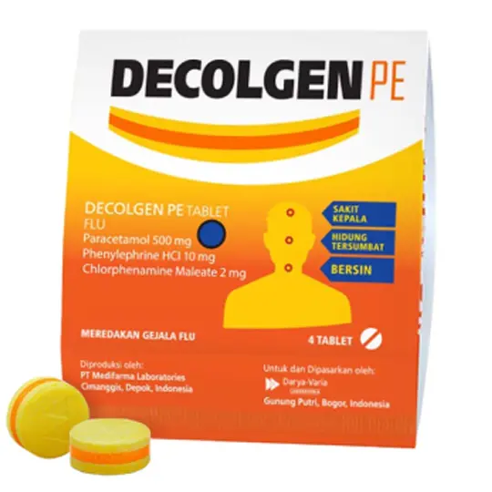DECOLGEN PE merupakan obat dengan kandungan Paracetamol, Phenylephrinee HCl, Chlorpheniramine maleate. Obat ini dapat digunakan untuk meredakan sakit kepala, hidung tersumbat, dan bersin.