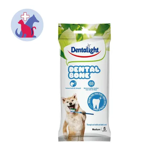 DENTALIGHT DENTAL BONE merupakan snack yang berfungsi untuk memperbaiki kekuatan gigi sekaligus membersihkan mulut anjing peliharaan Anda dari bakteri yang menyebabkan kerusakan pada gigi dan juga bau tidak sedap. Produk ini memiliki tekstur yang kenyal sehingga membantu untuk menghilangkan plak gigi dan tartar. Snack ini mengandung klorofil untuk menyegarkan bau mulut serta minyak ekaliptus yang berfungsi sebagai anti bakteri.