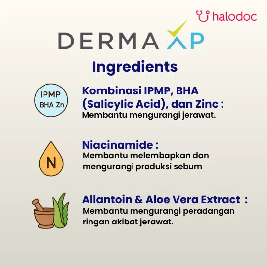 mengangkat sel kulit mati, Isopropyl Methylphenol dan Zinc Gluconate untuk menyekat minyak berlebih, serta Allantoin dan Ekstrak Aloe vera untuk memberikan rasa nyaman dan meredakan iritasi ringan pada kulit yang berjerawat.