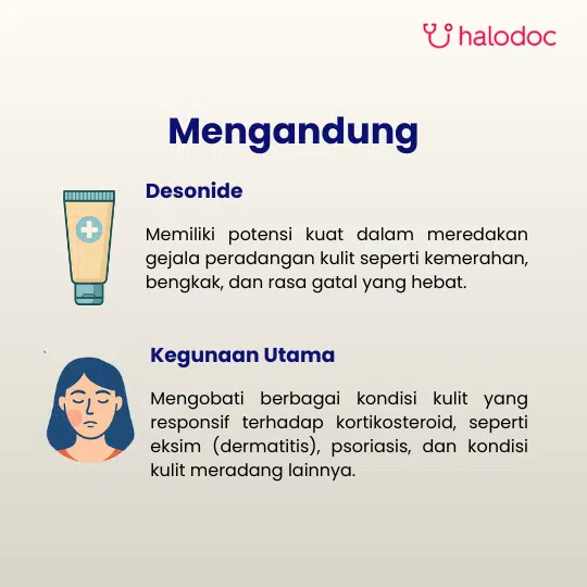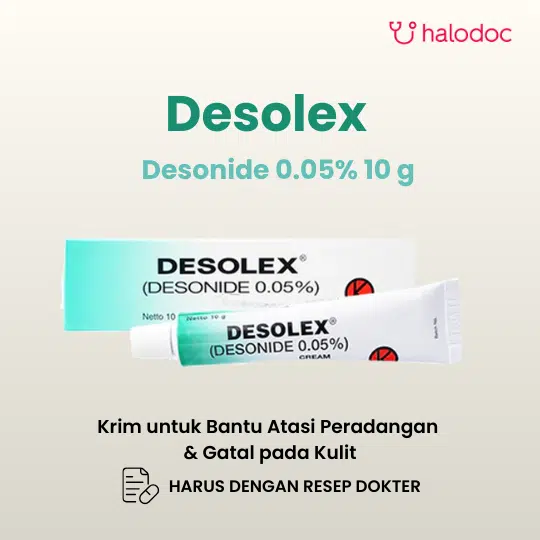 Desolex 0.05% Cream 10 g mengandung Desonide. Desonide adalah kortikosteroid topikal dengan potensi sedang (golongan II) yang digunakan untuk meringankan manifestasi inflamasi dan pruritus pada dermatosis yang responsif terhadap kortikosteroid.