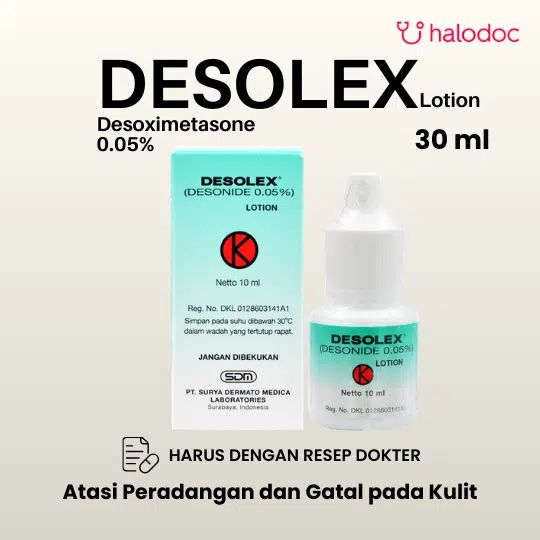 Desolex 0.05% Lotion 30 ml mengandung Desonide. Desonide adalah kortikosteroid topikal dengan potensi sedang (golongan II) yang digunakan untuk meringankan manifestasi inflamasi dan pruritus pada dermatosis yang responsif terhadap kortikosteroid.
