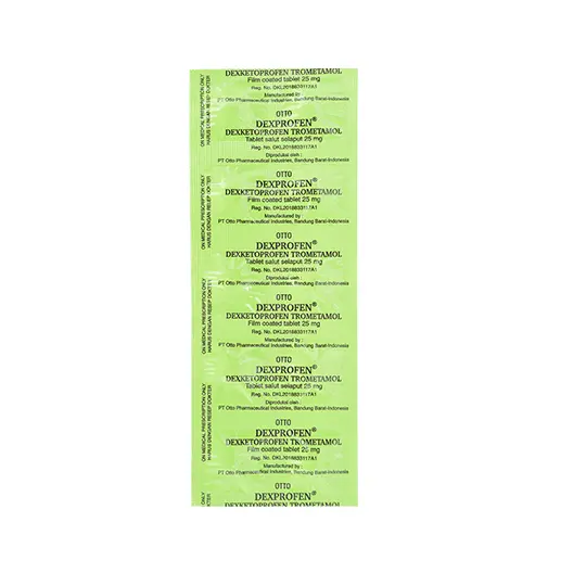 Dexprofen 25 mg adalah obat golongan antiinflamasi nonsteroid (OAINS) yang mengandung zat aktif dexketoprofen. Obat ini secara spesifik bekerja sebagai pereda nyeri dengan cara menghambat sintesis prostaglandin, suatu zat kimia di dalam tubuh yang berperan sentral dalam proses nyeri dan peradangan. Dengan menghambat enzim siklooksigenase (COX), obat ini secara efektif mengurangi intensitas nyeri. Dexprofen 25 mg diindikasikan untuk penatalaksanaan nyeri akut dengan intensitas ringan hingga sedang. Contoh kondisi yang bisa diatasi termasuk nyeri gigi, nyeri otot, dismenore, dan nyeri pasca-prosedur medis atau bedah. Dalam penggunaan obat ini harus SESUAI DENGAN PETUNJUK DOKTER. Pembelian obat ini memerlukan edukasi terkait penggunaan atau pengonsumsian obat yang tepat dan aman yang akan dikenakan biaya.