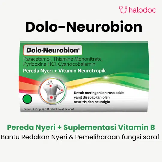 DOLO-NEUROBION adalah obat yang diformulasikan dengan aksi ganda untuk meredakan nyeri yang berkaitan dengan gangguan saraf (neuralgia). Informasi Umum Terkait Kandungan*: *Informasi ini bersifat edukatif dan tidak dimaksudkan sebagai klaim manfaat langsung dari produk. Obat ini mengkombinasikan Paracetamol, suatu analgesik yang bekerja di pusat nyeri di otak untuk meredakan rasa sakit, dengan Vitamin Neurotropik dosis tinggi (Thiamine Mononitrate (B1), Pyridoxine Hydrochloride (B6), dan Cyanocobalamin (B12)). Vitamin neurotropik ini berperan penting dalam menutrisi, memperbaiki, dan melindungi sel saraf, sehingga tidak hanya meredakan gejala nyeri tetapi juga membantu mengatasi kekurangan vitamin B yang dapat menjadi salah satu penyebab nyeri saraf.