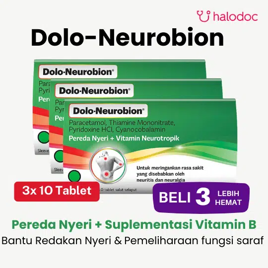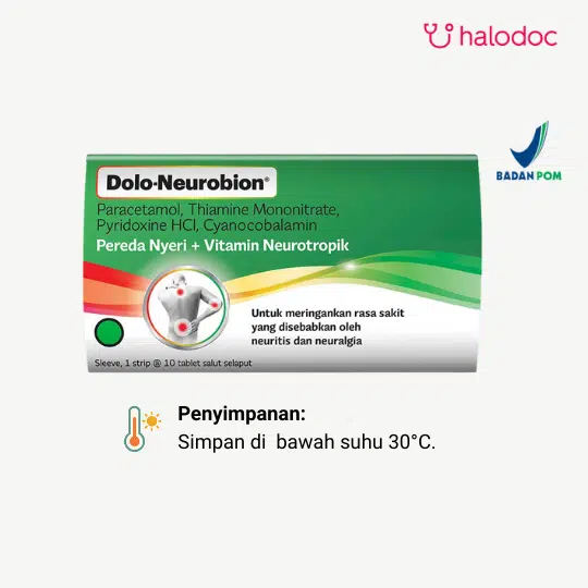 DOLO-NEUROBION merupakan obat pereda nyeri dan vitamin neurotropik dengan kandungan Paracetamol, Vitamin B1, Vitamin B6, Vitamin B12, yang dapat digunakan untuk mengurangi rasa nyeri karena neuritis dan neuralgia. Paracetamol bekerja menghambat sintesis prostaglandin sehingga dapat mengurangi nyeri ringan sampai sedang (analgesik). Vitamin B1 bekerja dengan memetabolisme karbohidrat, Vitamin B6 membantu memetabolisme protein dan asam amino, Vitamin B12 membantu memelihara keutuhan jaringan saraf.