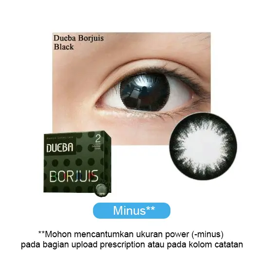 DUEBA Borjuis merupakan softlens dengan masa penggunaan 6 Bulan. Softlens ini memilki 1 varian warna yaitu Black. Produk ini memiliki kadar air 38% dan diameter 14.3 mm, sehingga nyaman digunakan dan membuat mata terlihat natural dengan bola mata yang tampak lebih besar.