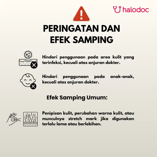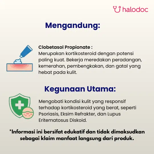 HARUS DENGAN RESEP DOKTER. Hanya untuk pemakaian luar. Obat ini sangat poten dan dapat menyebabkan supresi aksis HPA. Batasi area aplikasi dan durasi penggunaan. Hentikan pengobatan secara bertahap untuk menghindari fenomena rebound.