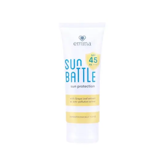 Emina Sun Battle SPF 45 PA+++ Merupakan sunscreen yang melindungi kulit dari paparan sinar UV dengan tekstur ringan dan cepat meresap. Mengandung grape leaf extract yang dikenal sebagai bahan anti polusi. Cocok digunakan untuk aktivitas outdoor maupun penggunaan sehari-hari