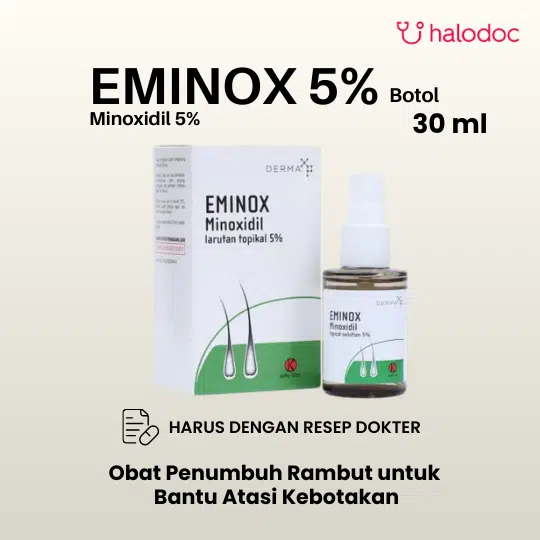Eminox 5% 30 ml merupakan obat dengan kandungan Minoxidil. Minoxidil adalah obat yang digunakan untuk membantu merangsang pertumbuhan rambut pada kondisi alopecia androgenetica (male/female pattern hair loss), khususnya pada area kulit kepala. Dalam penggunaan obat ini harus SESUAI DENGAN PETUNJUK DOKTER. Pembelian obat ini memerlukan edukasi terkait penggunaan atau pengonsumsian obat yang tepat dan aman yang akan dikenakan biaya.