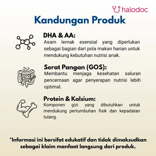 Laktosa , campuran minyak nabati ( minyak olein kelapa sawit , minyak kelapa minyak kedalaminyak bij bunga matahar ) , susu bubuk skim, konsentrat whey protein, galaktooligosakarida ( GOS ) . polidekstrosa ( PDX ) , premiks mineral , pengemulsi nobati ( lesitin kedelai ) , minyak sel tunggal ( sebagal umber asam arakhidonat ( ARA ) dan asam dokosaheksoenoot ( DHA ) , mengandung antioksidan tokoeral compuran pekat ) , premiks vitamin , sirup agung padat , inositol , taurin , L - karnitin , antioksidan askorbii palmitat ) . Mengandung alergen , lihat daftar bahan yang dicetak tebal