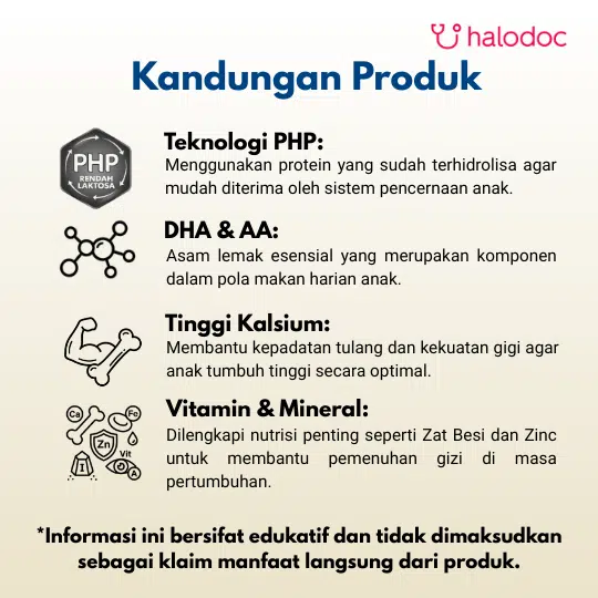 Sirup jagung padat , campuran minyak nabati ( minyak olein kelapa sawit , minyak kelapa , minyak kedelai , minyak biji bunga matahari ) , protein terhidrolisa parsial dari susu skim dan konsentrat whey protein , susa bubuk skim , konsentrat whey protein , premiks mineral , pengemulsi nabati ( lesitin kedelai ) , minyak sel tunggal sebagai sumber asam arakhidonat ( ARA ) dan asam dokosaheksaenoat ( DHA ) mengandung antioksidan tokoferol campuran pekat , premiks vitamin , inositol , taurin , L - kamitin , antioksidan ( askorbil palmitat ) Mengandung alergen , lihat daftar bahan yang dicetak tebal .