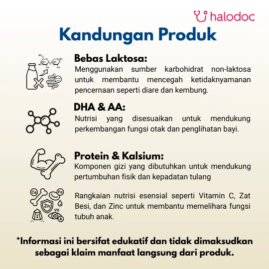 Produk ini merupakan pangan olahan keperluan medis khusus untuk bayi yang intoleransi dengan laktosa usia 0-12 bulan.