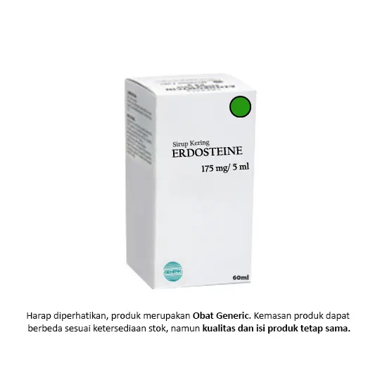 Erdosteine Dry Sirup adalah obat yang mengandung Erdostein. Erdosteine termasuk agen mukolitik (pemecahan mukus) yang diindikasikan untuk obstruksi saluran napas akut dan kronis. Erdosteine digunakan untuk mengobati masalah paru-paru yang berhubungan dengan produksi dahak (mukus) yang berlebihan, membantu mengencerkan dahak agar mudah dibatukkan. Ini juga digunakan untuk mengobati gejala episode pendek yang parah dari bronkitis kronis yang memburuk (kondisi di mana saluran napas meradang dan menghasilkan banyak dahak), gangguan pernapasan akut, dan gangguan pernapasan kronis yang berhubungan dengan produksi mukus berlebihan. Erdosteine bekerja untuk mengatur produksi mukus di saluran napas dan mengatur viskositasnya sambil meningkatkan transpor mukosiliar. Hal ini menyebabkan peningkatan ekspektorasi. Dalam penggunaan obat ini harus SESUAI DENGAN PETUNJUK DOKTER. Pembelian obat ini memerlukan edukasi terkait penggunaan atau pengonsumsian obat yang tepat dan aman yang akan dikenakan biaya.