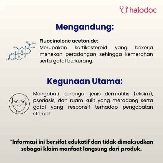 Fluocinolone acetonide 0.25 mg/g adalah obat kortikosteroid topikal yang digunakan untuk mengurangi peradangan, kemerahan, dan gatal pada berbagai kondisi kulit seperti dermatitis, eksim, atau psoriasis. Obat ini bekerja dengan menekan respons imun dan produksi zat peradangan di kulit, sehingga membantu meredakan gejala iritasi dan alergi. Sediaan ini dioleskan tipis-tipis pada area kulit yang sakit 2-4 kali sehari sesuai petunjuk dokter, dan tidak boleh digunakan pada kulit yang luka terbuka, infeksi, atau area sensitif seperti wajah dan lipatan tanpa anjuran medis. Efek samping yang mungkin muncul meliputi iritasi lokal, kulit menipis, rasa terbakar, atau perubahan warna kulit bila digunakan jangka panjang atau pada area luas. Penggunaan pada anak-anak, ibu hamil, atau menyusui harus dengan kehati-hatian karena risiko penyerapan sistemik. Obat ini hanya boleh digunakan sesuai resep dokter dan tidak dianjurkan untuk pemakaian berlebihan maupun jangka panjang.