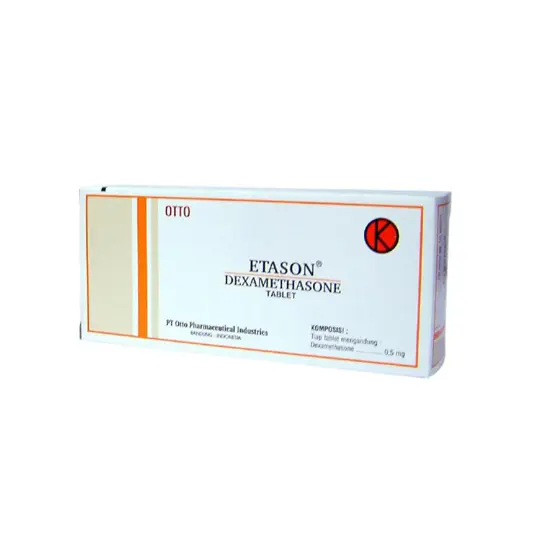 Etason yang mengandung dexamethasone. Obat ini termasuk kedalam hormon kortikosteroid (glukokortikoid) yang digunakan untuk mengurangi respons pertahanan alami tubuh dan mengurangi gejala seperti reaksi pembengkakan dan alergi. Dalam penggunaan obat ini harus SESUAI DENGAN PETUNJUK DOKTER. Pembelian obat ini memerlukan edukasi terkait penggunaan atau pengonsumsian obat yang tepat dan aman yang akan dikenakan biaya.