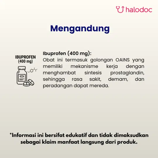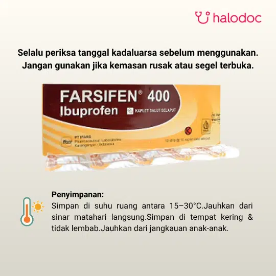 Farsifen 400 mg 10 Tablet adalah obat yang mengandung Ibuprofen 400 mg. Digunakan untuk meredakan nyeri dan peradangan ringan hingga sedang. Obat ini termasuk golongan OAINS yang memiliki mekanisme kerja dengan menghambat sintesis prostaglandin, sehingga rasa sakit, demam, dan peradangan dapat mereda.