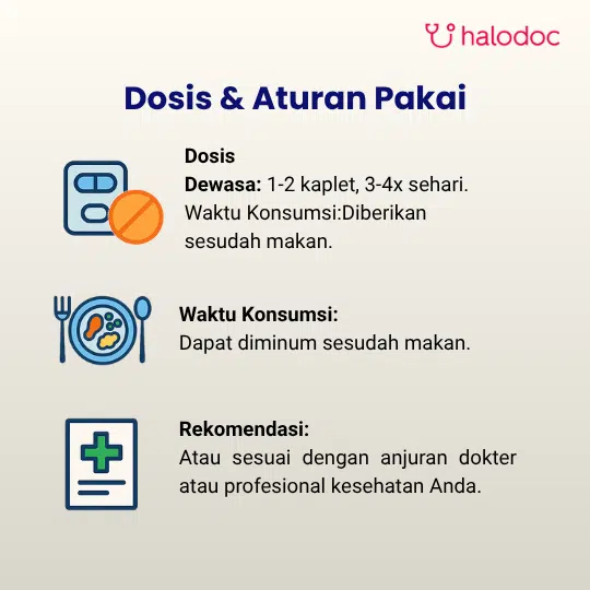 PENGGUNAAN OBAT INI HARUS SESUAI DENGAN PETUNJUK DOKTER. Dewasa: 1-2 tablet (200-400 mg), 3-4x sehari. Dosis maksimum: 2400 mg/hari. Dosis anak sesuai anjuran dokter.