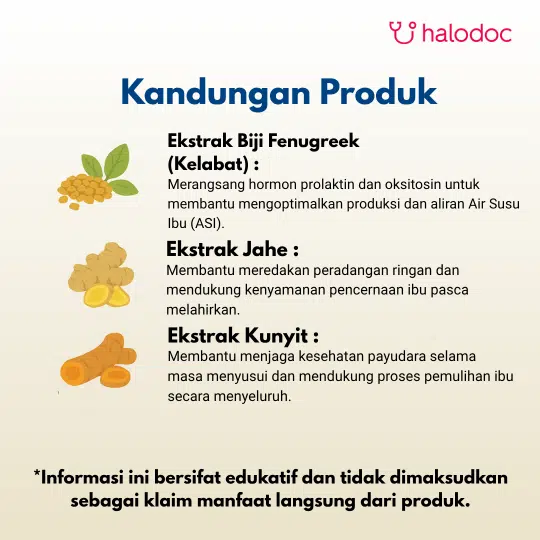 Produk ini mengandung biji fenugreek yang secara tradisional digunakan sebagai galactagogue (perangsang ASI). Formula ini didukung oleh jahe dan kunyit, memiliki sifat anti-inflamasi dan antioksidan yang membantu menjaga kesehatan serta pemulihan tubuh ibu pasca melahirkan.