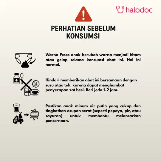 Dapat menyebabkan feses berwarna kehitaman, hal ini normal dan tidak berbahaya. Jauhkan dari jangkauan anak-anak untuk menghindari keracunan zat besi yang tidak disengaja. Simpan pada suhu di bawah 30°C.