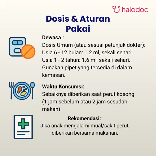 Diminum sebelum makan. Dapat diteteskan langsung ke mulut atau dicampur dengan sari buah.