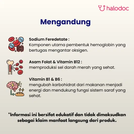 Produk ini mengandung Zat Besi (Fe), mineral esensial yang berperan penting dalam pembentukan hemoglobin, yaitu bagian dari sel darah merah yang bertugas membawa oksigen ke seluruh tubuh. Kecukupan zat besi sangat penting untuk mencegah anemia serta mendukung perkembangan kognitif anak. Formula ini juga dilengkapi dengan Vitamin B Kompleks (B1, B6, B12) dan Asam Folat yang bekerja sinergis dengan zat besi dalam proses pembentukan sel darah merah dan mendukung metabolisme tubuh.