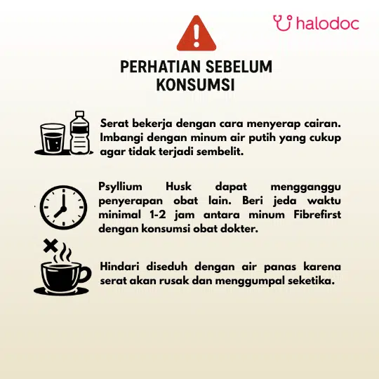 Larutkan 1 sachet Fibrefirst ke dalam 300 ml air dingin (jangan gunakan air hangat/panas). Kocok menggunakan shaker atau aduk cepat hingga rata, lalu segera diminum. Disarankan untuk diminum pada malam hari sebelum tidur.