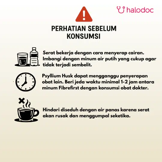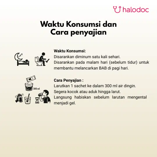 Larutkan 1 sachet Fibrefirst ke dalam 300 ml air dingin (jangan gunakan air hangat/panas). Kocok menggunakan shaker atau aduk cepat hingga rata, lalu segera diminum. Disarankan untuk diminum pada malam hari sebelum tidur.