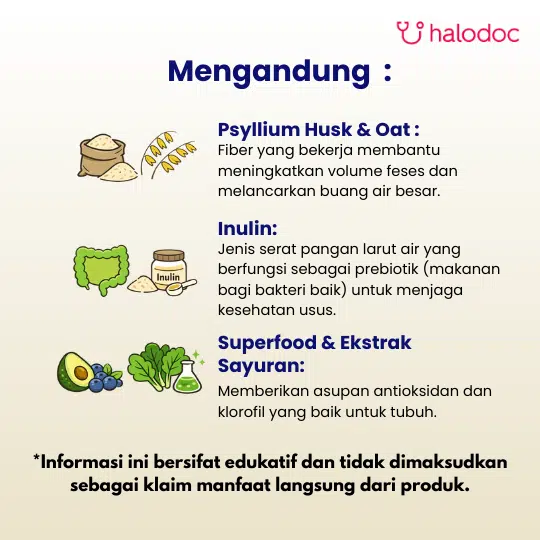 Psyllium Husk, Oat Fiber, Inulin, Wheatgrass, Ekstrak Buah dan Sayuran (misal Apel, Jeruk, Wortel, Bayam), Spirulina, Probiotik.